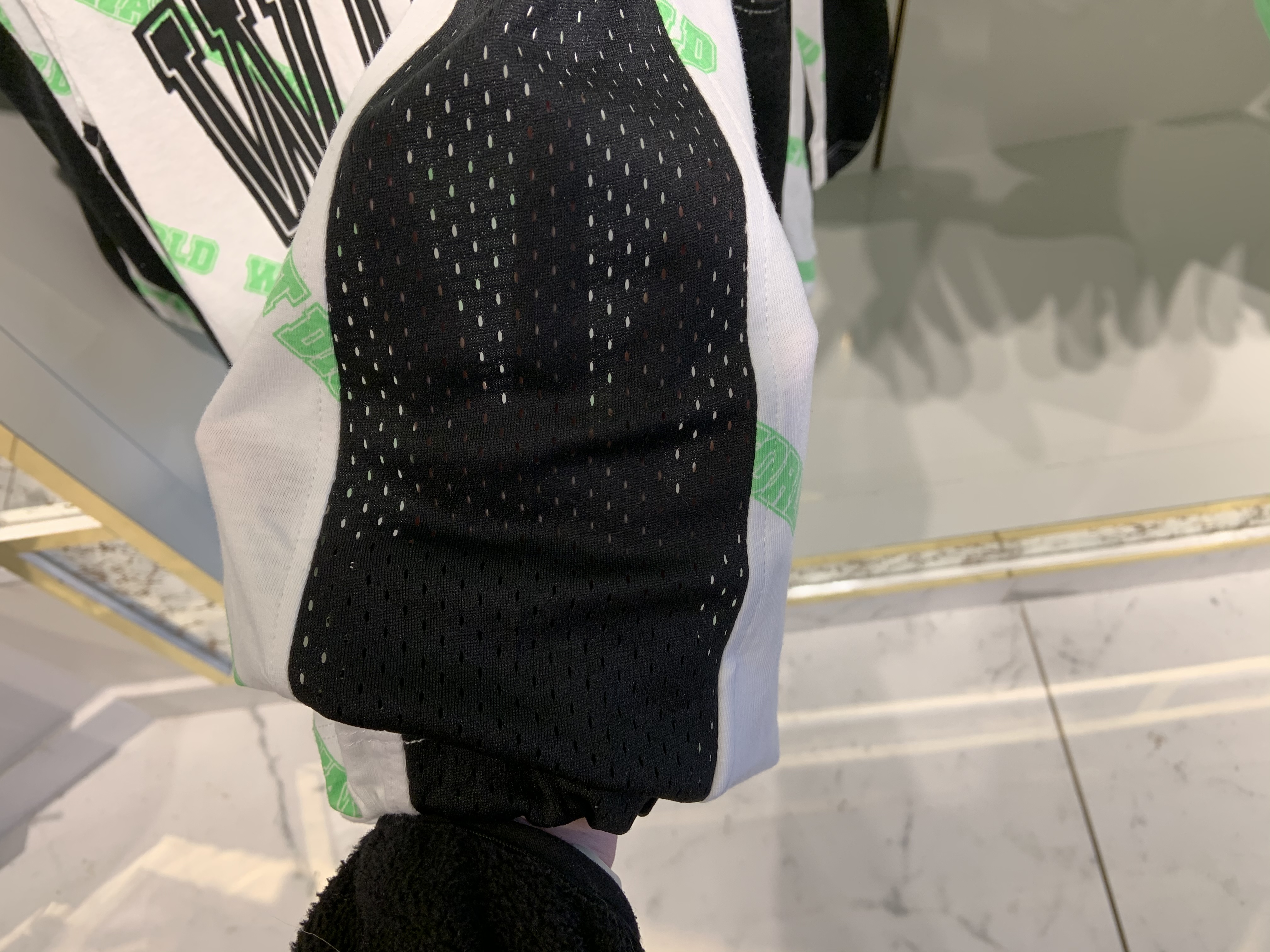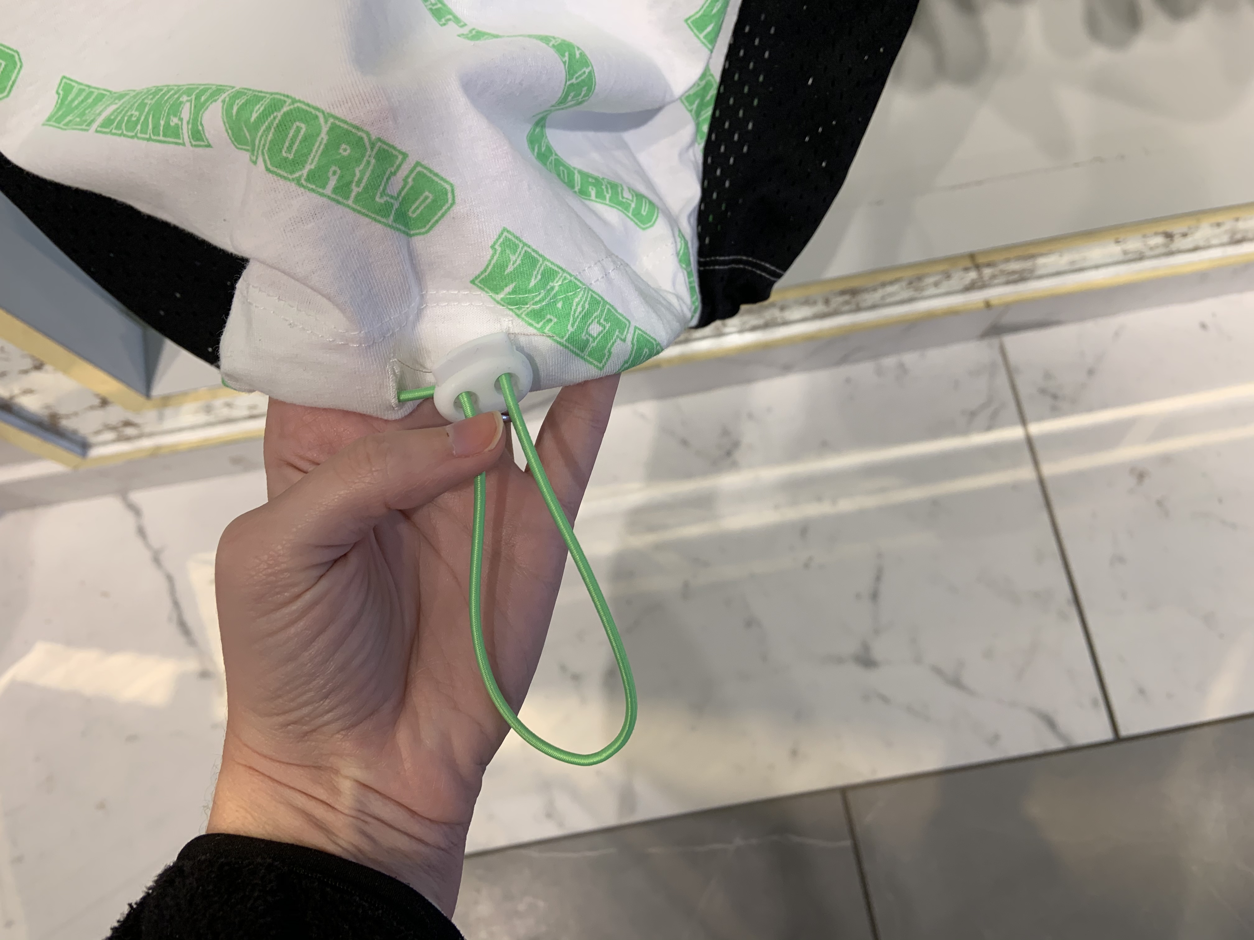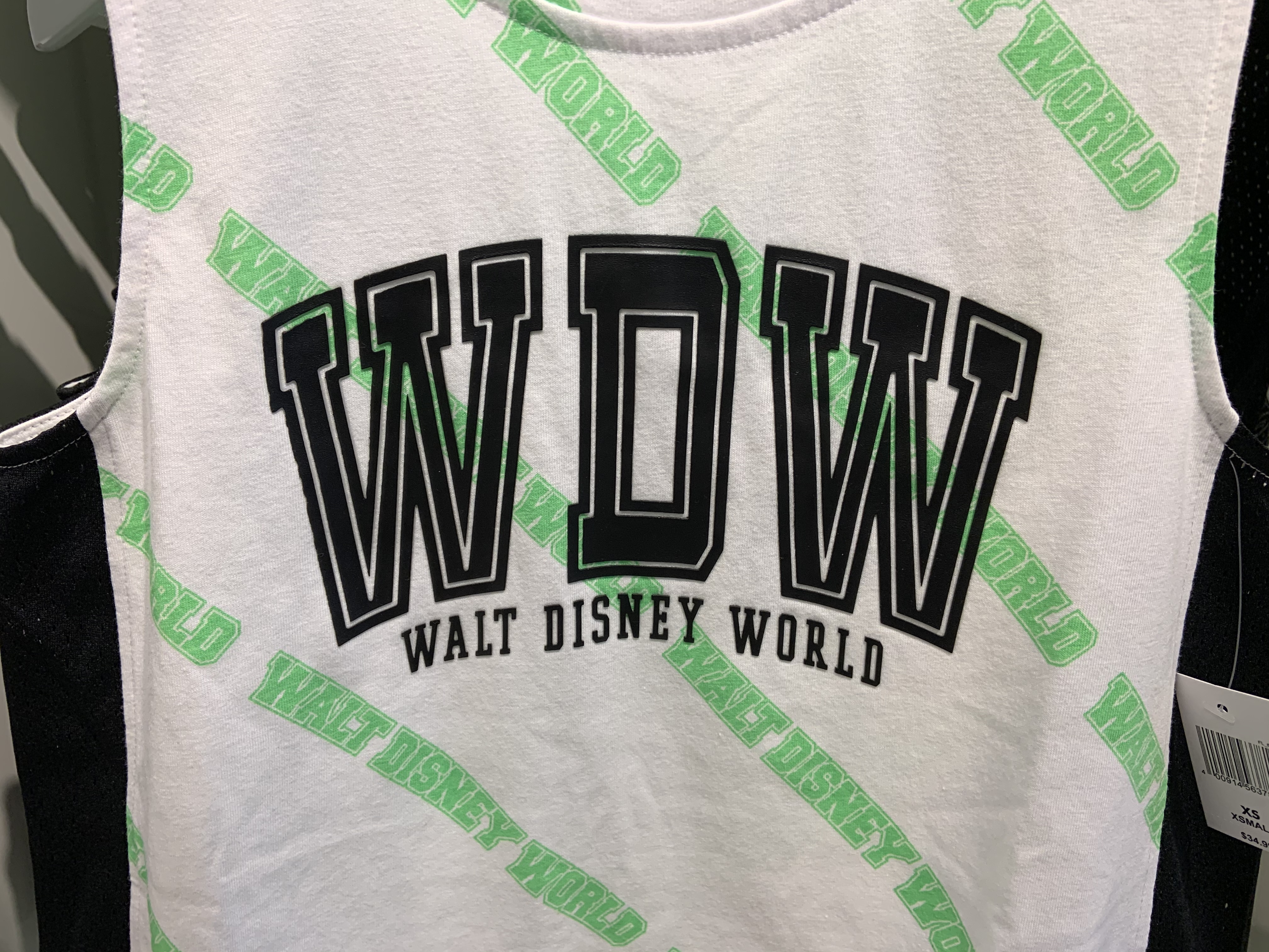 The sleeveless tank top is a while fabric with lime green “WALT DISNEY WORLD” text printed across it in a repeating diagonal stripe pattern. Across the chest it says “WDW WALT DISNEY WORLD” in black text. The sides of the shirt are the same black mesh as the long sleeved t-shirt, also without lining. At the bottom of the shirt there is a drawstring to make the hem more fitted. The back is plain with the green text pattern continued on it.