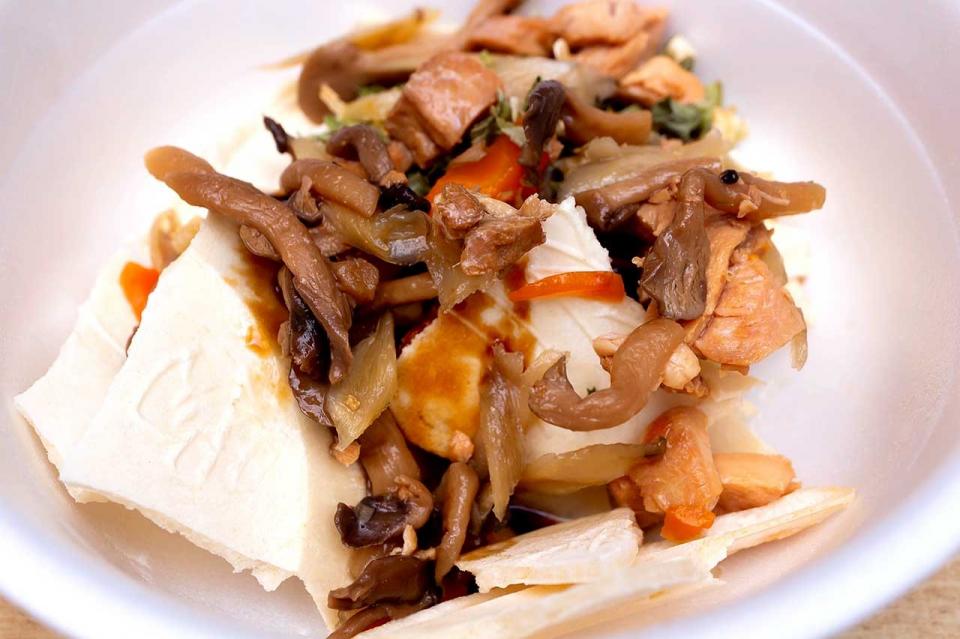 鶏肉やきのこがたくさん!レトルト調理品の袋には、青森県産の鶏肉を始め、ひらたけ、ごぼうが入っています。かなり具だくさんで、これは明らかにご馳走ですね。鶏肉は胸肉中心ですが、味が染みていてやわらかいです。ひらたけやごぼうにもしっかり味が染み渡っています。