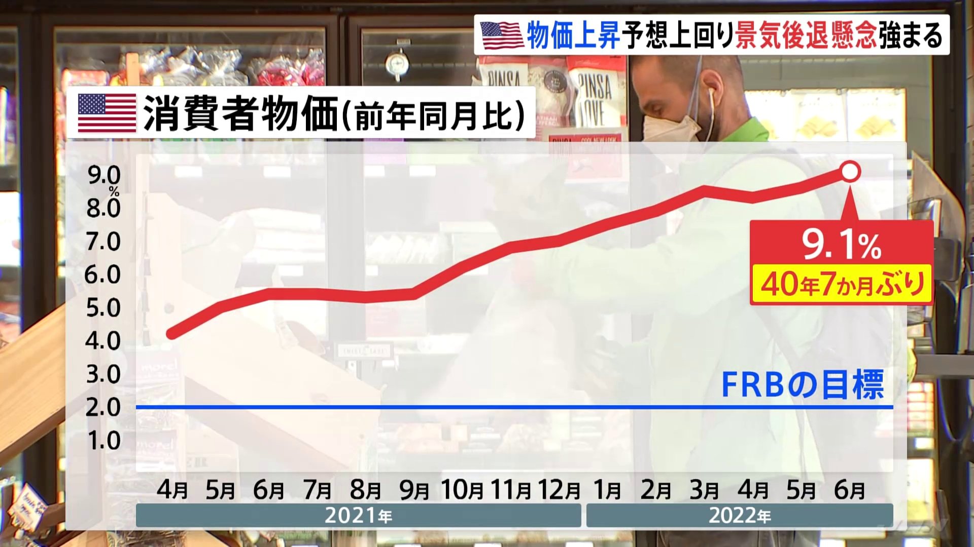 アメリカの先月の消費者物価指数は9.1%上昇し、およそ40年半ぶりの高い伸びとなりました。予想を上回る物価の上昇に景気後退への懸念が一段と高まっています。歴史的な物価高が続くアメリカ。先月の消費者物価の伸…
